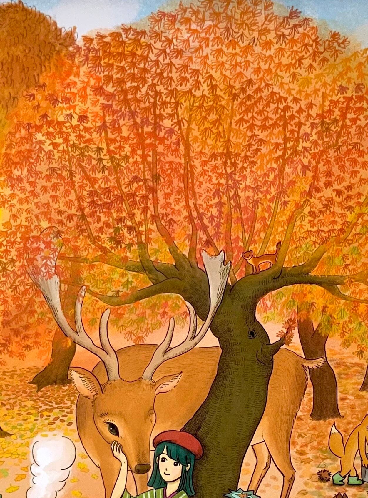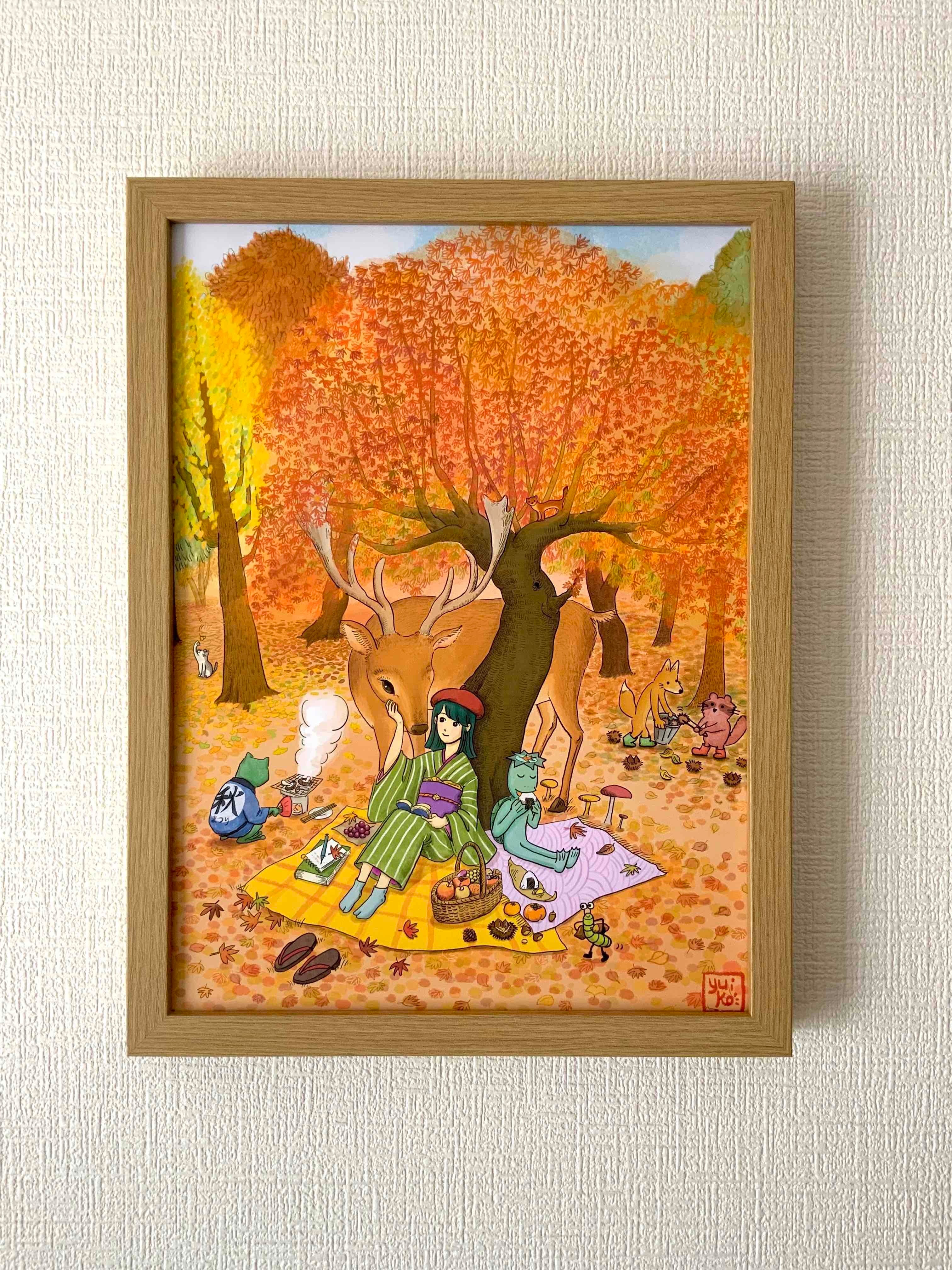 紅葉した森の中で仲間たちと楽しく過ごす様子を描いたポスターです。